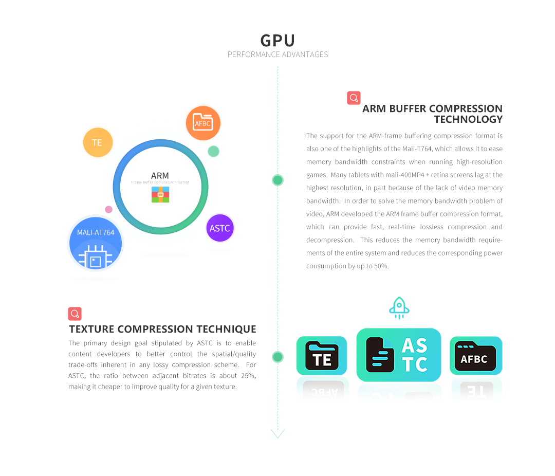 GPU uses Mali-T764 GPU, supports TE, ASTC, AFBC memory compression technology